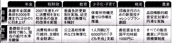 で、自民党と民主党の政策の一覧である。他の政党もあるが、これは端折った。というのも、衆議院が小選挙区となった今日、大きく腑分けできるのは、二大勢力であり、資本主義を前提とする政治は、自由主義と社会民主主義による「制度」でしかないからである。そこから大きく逸脱する勢力には、国粋主義としての極右翼、デフレを経済成長率が下がるから是とする「環境」を優先する環境極サヨクなどがあるが、それらは、政治的余興であろう。
