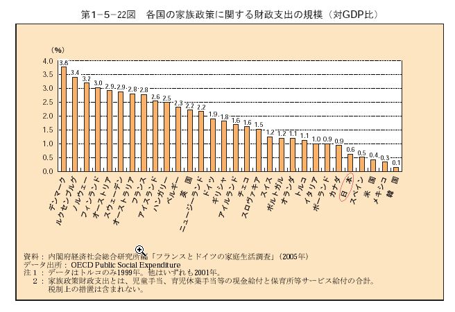 で右の表が少子化などの家族政策に対する対GNP比率ですわ。で、注意すべきは、2003年度の社会保障給付費の全体84.3兆の高齢者関係には全体の約7割の59兆円が給付されているのに対し、児童・家族関係給付費は全体の約4パーセントの3.2兆円に過ぎない。一人当たりの給付費で観ると高齢者が247万円に対して、子供一人に対して約17万円という計算になる。