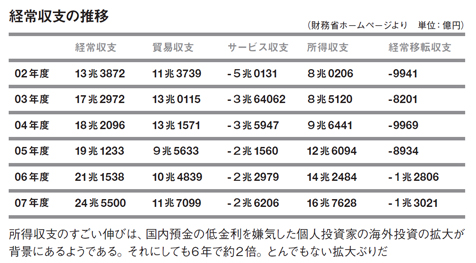 所得収支とは、日本が持つ海外の株や債券、つまり証券資産などが生む配当や利益を示す。要するに投資収益だが、この額が近年大きくなり、貿易黒字に匹敵する規模になっていったのだ。そして貿易黒字額の縮小もあって投資による黒字がとうとう逆転。2007年度の数字でも、貿易黒字が前年度比11.7%増の11兆7099億円に対し、所得収支は前年度比17.6%増の16兆7628億円。実に1.5倍規模なのだ。