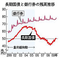 このグラフに見られるように、日本銀行は、日銀の発行するお金の量以下に長期国債の引き受け残高を絞っている。これを日銀発行権ルールというらしいが、このルールが守られる限り、量的金融緩和も十分な機能果たさないだろう。というのも、日銀券つまりは通貨供給は実体経済へ回って、市中の様々な企業、さまざまな生き方をしている家計に使われるようになって意義をもつものであるからである。